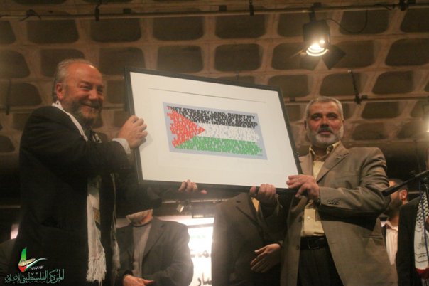 Galloway with Hamas leader Ismail Haniyeh in Gaza, holding up a Viva Palestina poster, January 2010