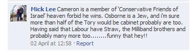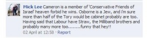 Before going to the meeting he put out the following message on his Facebook group – “Graham Taylor is off to that centre of Islamic fundamentalism – Tower Hamlets Town Hall”. A number of his Facebook friends then responded, including former councillor and Labour’s council candidate for Stepney ward Judith Gardner. Gardner wrote “Give em hell!”. Another friend wrote the disgusting racist comment: “Bring some pork scratchings” and another “Pork!”.