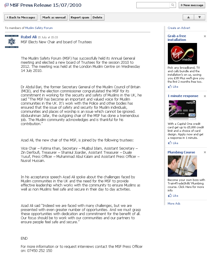 The civil servant who first came to prominence for using his (Islamic Forum Europe) blog to praise Abdullah Azzam and justify killing British troops, before attempting to sue the Daily Mail for reporting these facts (only to be told by Justice Eady that his case had about it “an absence of reality”) has now been elected the Chair of the Muslim Safety Forum (MSF). That is, according to a Facebook message that I received earlier from Rubel Ali, Muslim Safety Forum Project Administrator. For those not so familiar with the MSF, it’s an IFE linked organisation which, like IFE, is based at the London Muslim Centre.