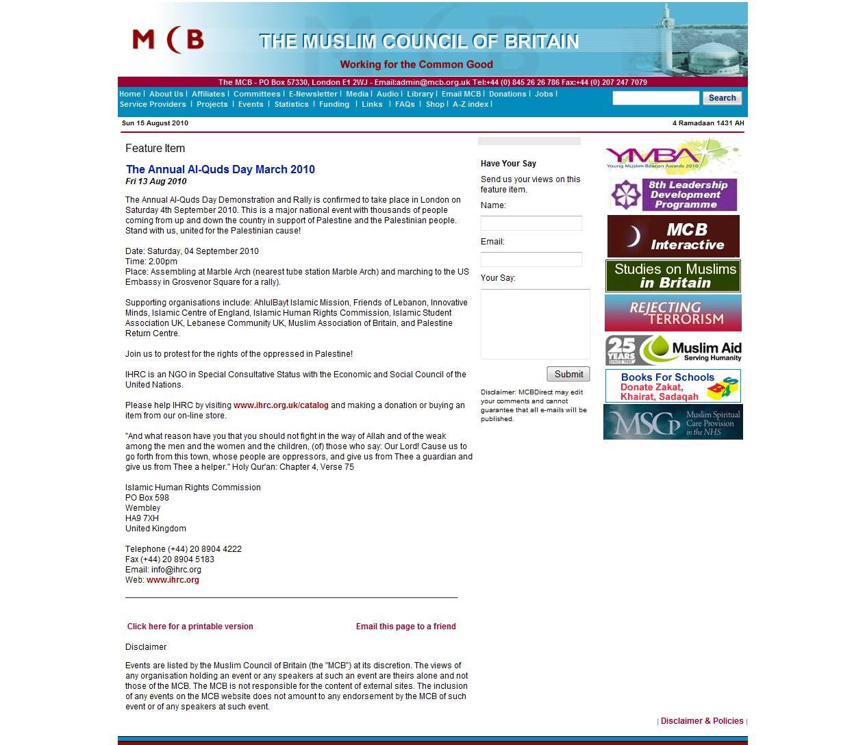 The Muslim Council of Britain kindly put up a big ad for the march on its site: