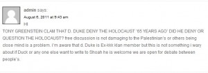 i’m aware that d. Duke is Ex-kkk klan member but this is not something i wary about if Duck or any one else want to write to Shoah he is welcome we are open for debate between people’s.