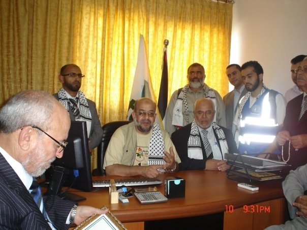 Here’s Ahmed Al-Kurd (on the left) again, this time paying a visit to the opening ceremony of Interpal’s Gaza office. Seated behind the table are Essam Mustafa and Majdi Aqil. Aqil is Interpal’s Manchester representative. Before moving to the UK, he was a member of Hamas in Gaza. Among those standing in the background are Zaid Hassan and Ibrahim Dar, Interpal’s Bradford representative and a fan of Al Qaeda preacher and recruiter Anwar Al-Awlaki.