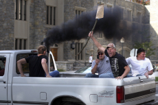 Here in southwest Virginia, The Roanoke Times reported last week on an Occupy Virginia Tech rally, including this photo of counterprotesters driving past waving a sign saying “Go home hippies”: