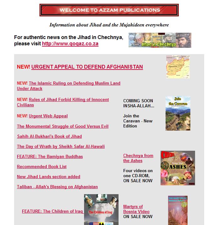 This is what azzam.com looked like just five days after 9/11. The main headline is “URGENT APPEAL TO DEFEND AFGHANISTAN”. (Click to enlarge.)