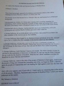 In what must be the most disgusting use of ethnic-religious-race baiting in recent times, the campaign team of George Galloway’s soon to be failed bid to take Bradford West has published this piece of literature for the Muslims of Bradford West whom, with other voting-age citizens, go to the polls today.
