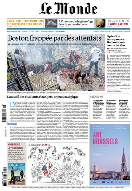 Above the fold is a graphic image of the human suffering following the terrorist bombing of the Boston Marathon. Jamie Kirchick draws our attention to the cartoon below the fold.