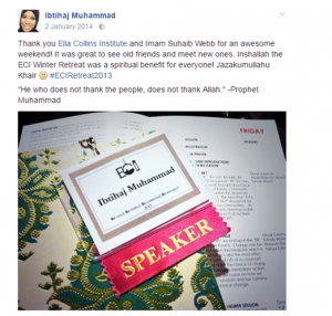 Muhammad has also attended and spoken numerous times at ICNA conventions as well. After speaking at their 2012 convention (an event which was taglined ‘Understanding Shariah’), Muhammad praised the organisation stating ‘ICNA never ceases to amaze me!!!’.