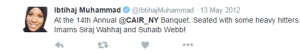 Muhammad has tweeted her pleasure at being seated near both Webb and Wahhaj at a CAIR-NY banquet in 2012 where they were keynote speakers. She herself was listed as a speaker alongside Wahhaj at an MAS-Arizona event later that year. She also tweeted updates that she’s listening to his speeches and thanked him for visiting her hometown for an ICNA event. She also spoke warmly of him in a photo she posted alongside his daughter saying she ‘reminds me so much of her dad’ and that she prays ‘she is able to reach as many people as her father’.