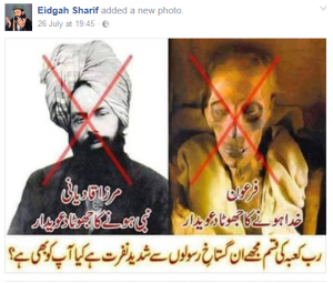 Consider a sinister image posted this summer on the Facebook account of Eidgah Sharif, the shrine his family runs in Rawalpindi. The man on the left is Mirza Ghulam Ahmad, the founder of the Ahmadiyya movement. On the right is an alleged image of one of the Pharaohs. The image says that Mirza falsely claimed to be a prophet while Pharaoh falsely claimed to be God. The caption at the bottom says the poster swears by God that he hates these “Gustakh e Rasools” – those who disrespect the prophet. In these dark times Gustakh e Rasool is a term best read as incitement to hatred, including violence.
