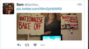 Here’s what seems to be an admission from the prankster – and the fact that the half hidden sign says ‘Nationalise Bake Off’ makes the ‘satire’ rather clearer.