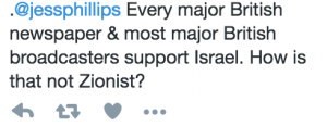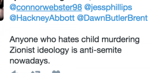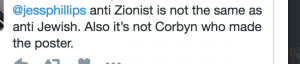 I saw the same image retweeted by several people, mostly Labour moderates.  It’s easy to understand the irritation of many Corbyn supporters particularly as it is claimed that the word ‘Zionist’ was covered up most of the time (as it is in the photograph above).  On the other hand a different bunch of people – and although they weren’t all active Corbyn supporters, some certainly were – seemed oblivious to the satire and instead tried to argue that there was no problem at all with the poster.  Here’s a sample taken only from people who seem to be Corbyn fans.