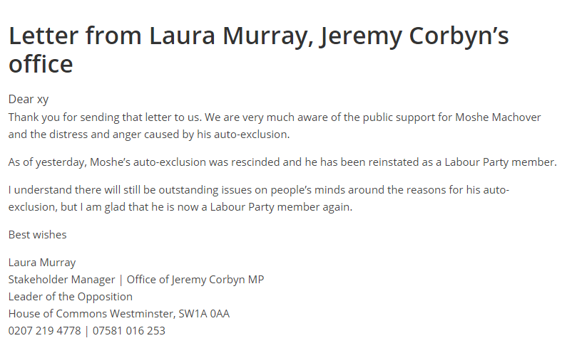 Note that the letter came from Corbyn’s office not from Labour Party HQ nor the Compliance Unit.